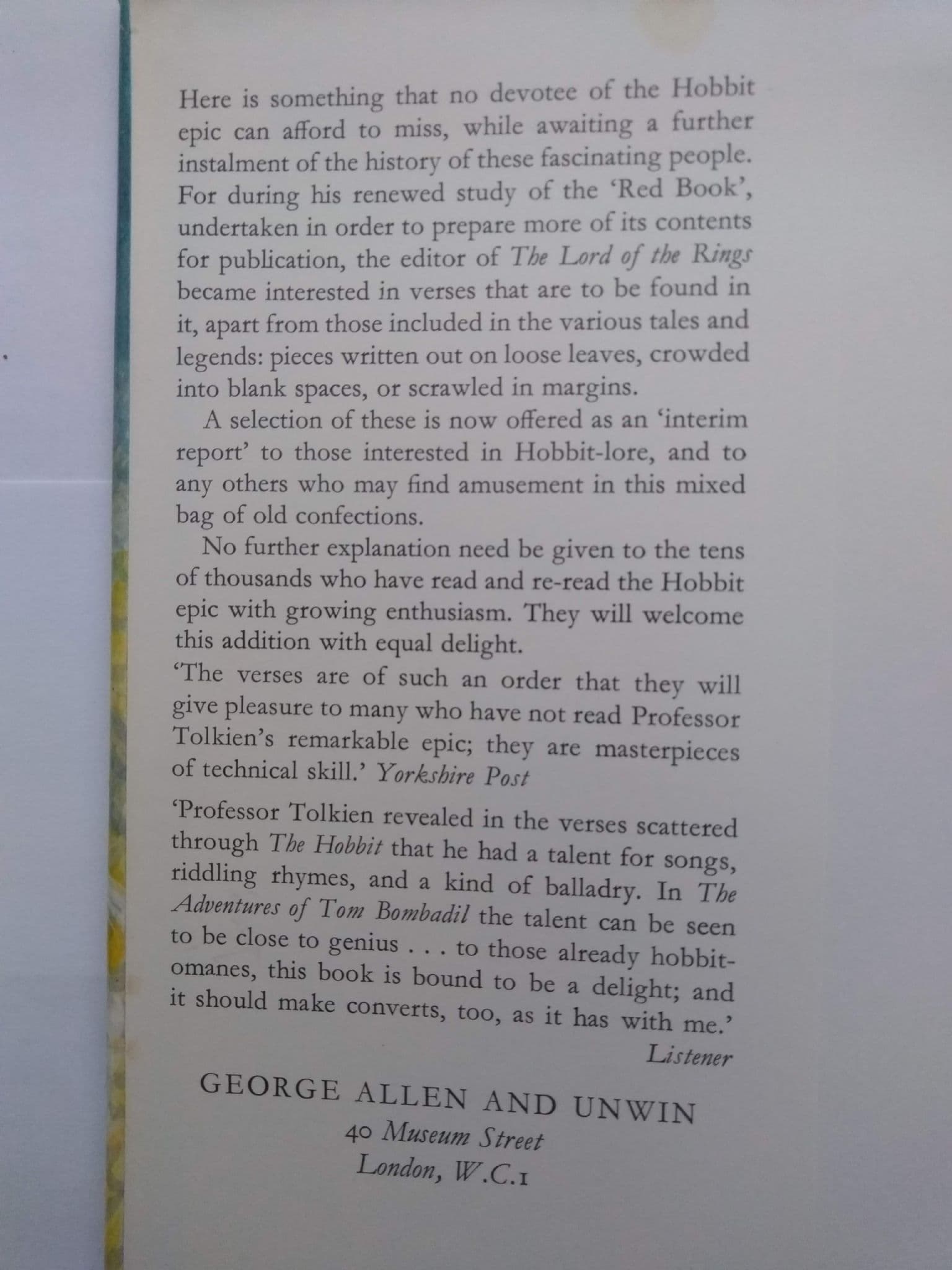 THE ADVENTURES OF TOM BOMBADIL by J.R.R TOLKIEN (Hardcover)