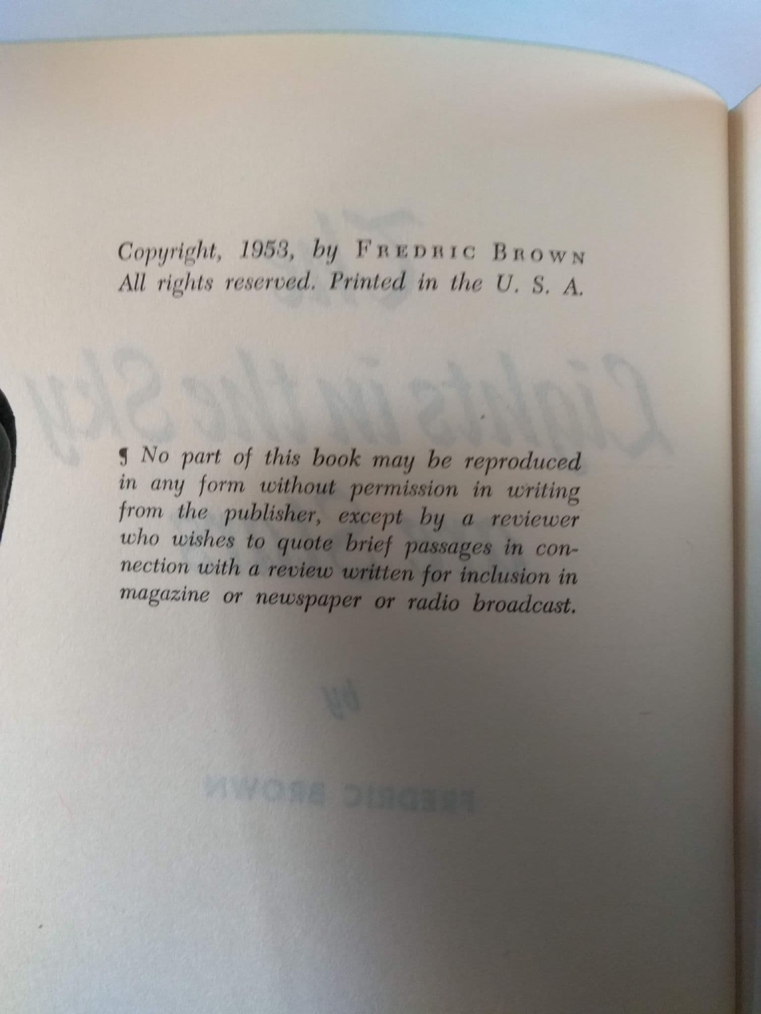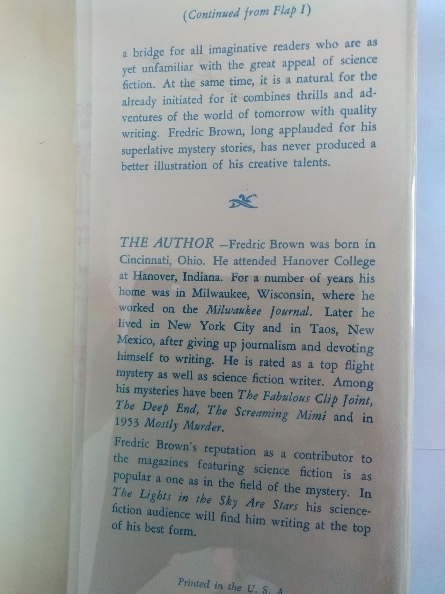 ONLY FREDRIC BROWN COULD HAVE WRITTEN THIS DEEPLY MOVING SCIENCE FICTION NOVEL ABOUT ONE MAN'S EPIC LIFE LONG STRUGGLE TO OPEN MANKIND'S PATHWAY TO THE STAR'S.